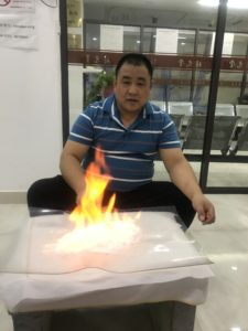 Als er danach mit dem Messer für die Hornhautentfernung auftauchte, lehnte ich dankend ab (ich hatte in Hongkong einmal ein schlechtes Erlebnis damit). Daraufhin verschwindet er und kommt mit einer weissen Substanz wieder aus seinem Kabäuschen, die er vor meinen Augen – und vor allem vor meinen Füssen – anzündet! Reflexartig griff ich zur Kamera, denn das hätte mir sonst niemand geglaubt… Mein Chinesisch reichte aus, um herauszufinden, dass das Salz war. Er machte damit ein wunderbares, warmes Peeling :-). Und als ich schon ganz erschöpft im Sessel hing, holte er vier Becher, schmier irgend eine Flüssigkeit hinein und zündete das Ganze auch wieder an. Und hielt die Becher an meine Fusssohlen, wo sie dank Vakuum „kleben“ blieben. So also funktioniert Schröpfen! Und ich wollte doch nur ein bisschen die Füsse kneten lassen…