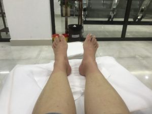 Zuerst musste ich wie immer die Füsse in heissem Wasser baden. Und HEISS war es tatsächlich, der Masseur musste zwei Mal kaltes Wasser nachfüllen, bevor ich meine Füsse überhaupt hineinstecken konnte (eigentlich hätte ich ein drittes Auffüllen gebraucht, aber das liess mein Stolz dann doch nicht zu). Siehe die roten Abdrücke im Beweisfoto!