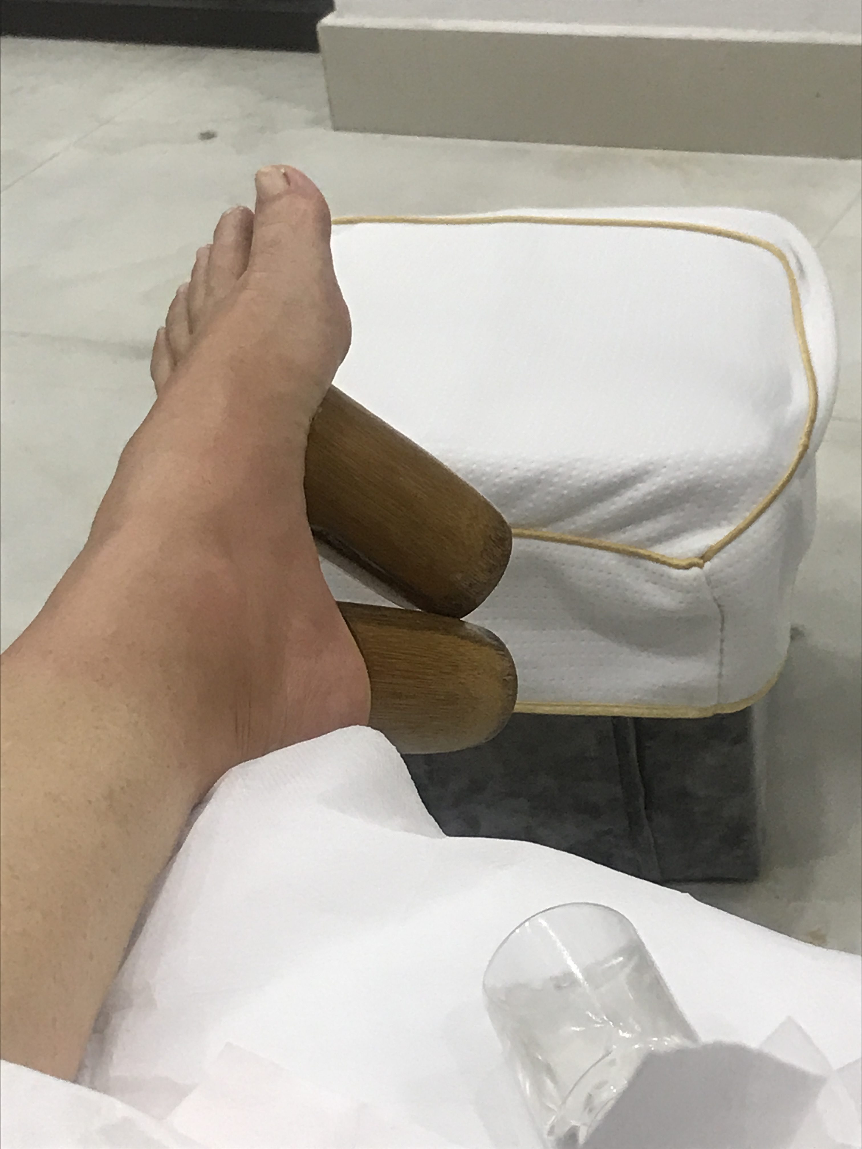 Zuerst musste ich wie immer die Füsse in heissem Wasser baden. Und HEISS war es tatsächlich, der Masseur musste zwei Mal kaltes Wasser nachfüllen, bevor ich meine Füsse überhaupt hineinstecken konnte (eigentlich hätte ich ein drittes Auffüllen gebraucht, aber das liess mein Stolz dann doch nicht zu). Siehe die roten Abdrücke im Beweisfoto!