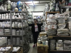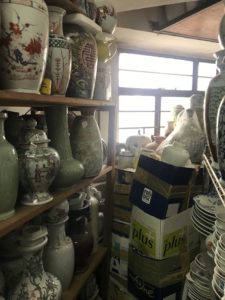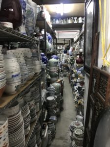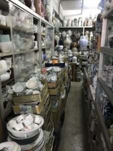 Jeder Zentimeter ist vollgestopft mit Waren, deren Hauptabnehmer Restaurants und Hotels sind. Es sitzen auch zwei uralte Arbeiter mittendrin (die ich allerdings nicht fotografieren durfte), die gewisse Teller noch von Hand verzieren. Wir fragen uns heute noch, wie sie erstens die Übersicht über all die Sachen haben und wie sie zweitens die Sachen herausfischen, die ganz hinten oder ganz unten stehen… Unglaublich!!